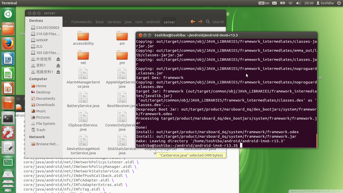 然后进入core/android/os/底下创建ICanService.aidl文件写入接口函数,修改对应配置文件。然后到com/android/server/底下创建了CanService.java文件对接口进行实现,对应的配置文件也修改。编译得到framework.jar如下图。