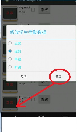 2、直接在getView函数中,修改按钮采用匿名内部类实现OnClickListener接口,点击确定后,获取到设置的index值(整型索引从0开始,设置为迟到索引值就是1,早退就是2),并且ImageView控件的引用肯定是获取到了,直接设置图片