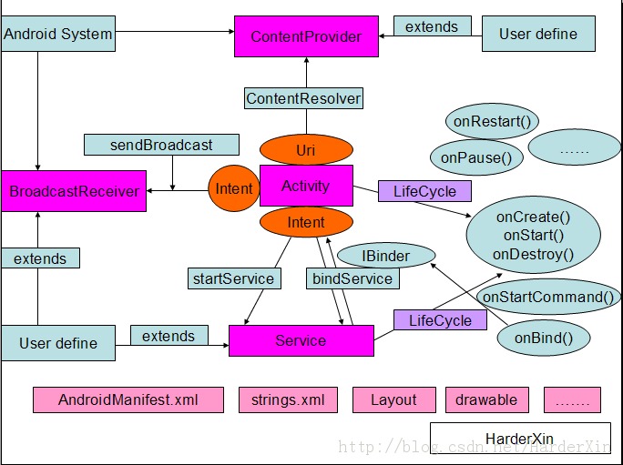 最近学完了Android的四大组件的基础知识,自己总结了一个图示,希望自己看到这个图的时候能回忆起相关的知识点,与大家分享!
