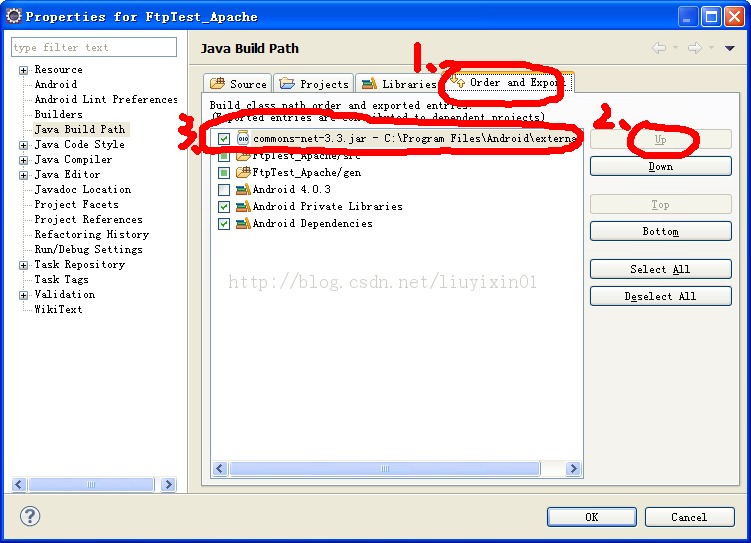 3、在Order and Export选项卡中,点击右侧的Up,将刚才引入的jar包放到最上方的位置,前边的勾记得要勾上!