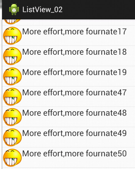 public class MainActivity extends Activity { private ListView listView; private int i=0; @Override protected void onCreate(Bundle savedInstanceState) { super.onCreate(savedInstanceState); setContentView(R.layout.activity_main); listView = (ListView)findViewById(R.id.list); listView.setAdapter(new MyAdapter()); } private class MyAdapter extends BaseAdapter{ @Override public int getCount() { return 50; } @Override public Object getItem(int arg0) { return null; } @Override public long getItemId(int position) { return 0; } @Override public View getView(int position, View convertView, ViewGroup parent) { View view = View.inflate(MainActivity.this, R.layout.show, null); ImageView image = (ImageView)view.findViewById(R.id.image); image.setImageResource(R.drawable.win); TextView textView = (TextView)view.findViewById(R.id.textView); textView.setTextSize(20); textView.setText("More effort,more fournate" + i++); return view; } } }?