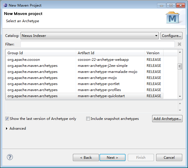 ?2、选中Maven Project, 点击Next,然后保持默认选项,再点击next,弹出如下窗口