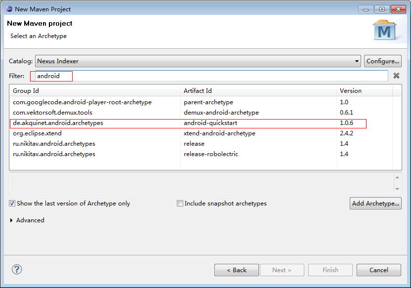 3、在过滤器中输入android,如果你已经有这样的插件,将会显示出来,否则就需要通过Add Archetype按钮进行添加