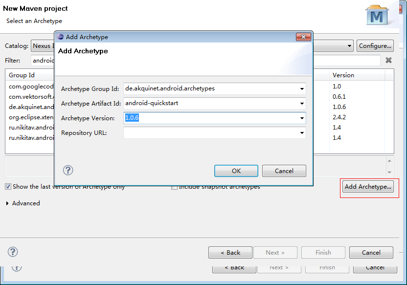 如果系统没有找到android-quickstart插件,则需点击Add Archetype,弹出如下窗口,然后将所需要的插件的groupid,artifactid及版本号输入进去,根据准备工作中提及,分别是: