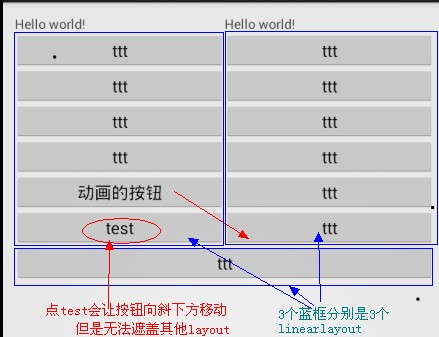 如图所示,蓝色的框框是3个linearlayout, test按钮会让上面的那个按钮斜下方移动,但是移动到另外两个layout以后就会被遮盖住,怎么能让他不遮盖住啊?
