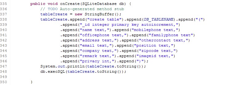 DB_TABLENAME 前少了一个空格,familyphone text后少了一个逗号;最后多了一个逗号。如楼上所说,打印一下sql语句,你就知道了。