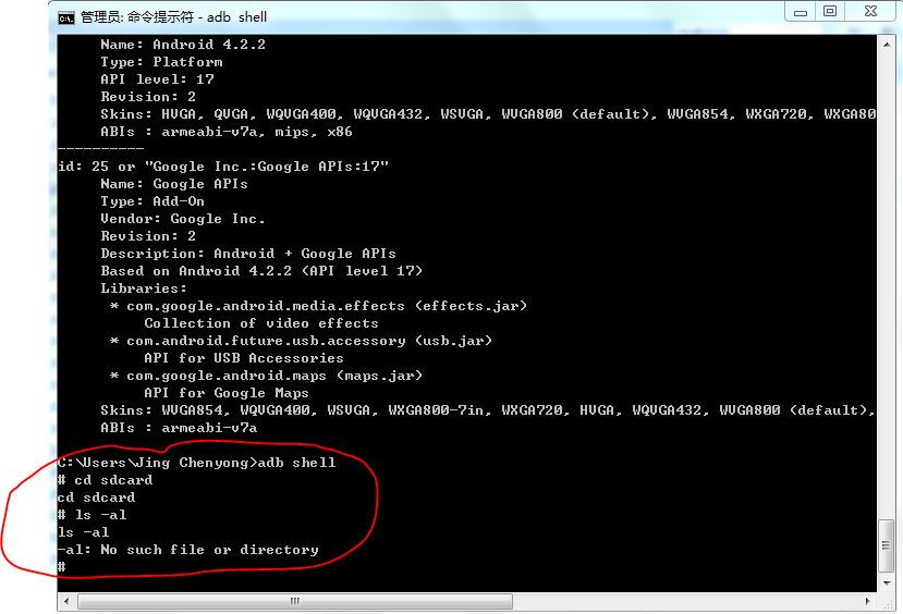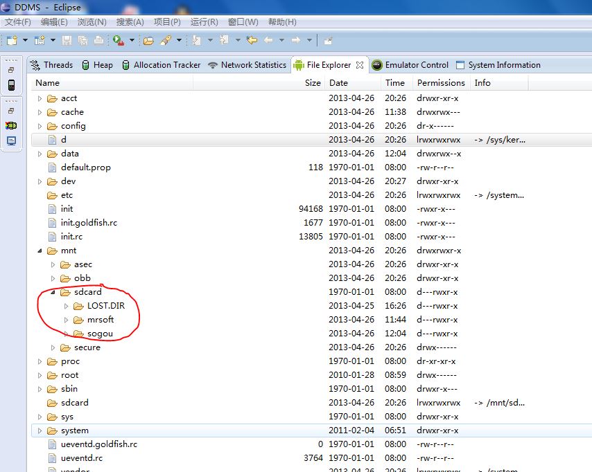 使用DDMS透视图打开SD卡用文件,然后使用在命令行中使用ls -al命令查看SD卡中包含的全部文件怎么显示没有文件和文件夹啊?!然后再使用mkdir命令创建一个新的文件夹“mrsoft”(之前创建过),所以显示“mkdir failed for mrsoft,File exists”.可是为什么用ls -al命令不能显示出来呢?下面是截图。