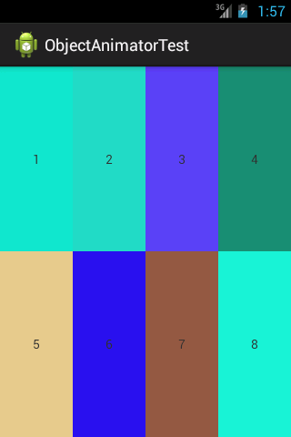 package com.example.objectanimatortest;import java.util.Random;import android.os.Build;import android.os.Bundle;import android.animation.Animator;import android.animation.AnimatorListenerAdapter;import android.animation.AnimatorSet;import android.animation.ArgbEvaluator;import android.animation.IntEvaluator;import android.animation.ObjectAnimator;import android.animation.ValueAnimator;import android.annotation.TargetApi;import android.app.Activity;import android.graphics.Color;import android.view.Menu;import android.view.TextureView;import android.view.View;import android.view.animation.AccelerateInterpolator;import android.view.animation.DecelerateInterpolator;import android.widget.TextView;@TargetApi(Build.VERSION_CODES.HONEYCOMB)public class MainActivity extends Activity implements View.OnClickListener{	private TextView[] tv;	@Override	protected void onCreate(Bundle savedInstanceState) {		super.onCreate(savedInstanceState);		setContentView(R.layout.objectanimatortest);		tv = new TextView[]{			(TextView) findViewById(R.id.tv01),			(TextView) findViewById(R.id.tv02),			(TextView) findViewById(R.id.tv03),			(TextView) findViewById(R.id.tv04),						(TextView) findViewById(R.id.tv11),			(TextView) findViewById(R.id.tv12),			(TextView) findViewById(R.id.tv13),			(TextView) findViewById(R.id.tv14)		};		initTextViews();	}	private void initTextViews(){		for(TextView textView :tv){//颜色随机变化代码    使用ValueAnimator类给每个视图加上北京颜色随时间变化的动画			int color1 = Color.rgb((new Random()).nextInt(255), (new Random()).nextInt(255), (new Random()).nextInt(255)) ;			int color2 = Color.rgb((new Random()).nextInt(255), (new Random()).nextInt(255), (new Random()).nextInt(255)) ;			ValueAnimator animator = ObjectAnimator.ofInt(textView, "backgroundColor", color1,color2);			animator.setDuration(3000);			animator.setEvaluator(new ArgbEvaluator());//设置数值计算器,保证动画变化过程中的数值正确			animator.setRepeatCount(ValueAnimator.INFINITE);			animator.setRepeatMode(ValueAnimator.REVERSE);			animator.start();						textView.setOnClickListener(this);		}	}	@Override	public boolean onCreateOptionsMenu(Menu menu) {		//getMenuInflater().inflate(R.menu.activity_main, menu);		return true;	}	@Override	public void onClick(final View view) {		final ValueAnimator animator1 = ObjectAnimator.ofFloat(view, "alpha",1,0);//淡出效果		animator1.setDuration(1000);		animator1.setInterpolator(new AccelerateInterpolator());		ValueAnimator animator2 = ObjectAnimator.ofFloat(view,"x",view.getX(),(view.getX()-view.getWidth()));//向左移动效果		animator2.setDuration(1000);		animator2.setInterpolator(new DecelerateInterpolator());				AnimatorSet animatorSet = new AnimatorSet();//合起来就是左淡出效果		animatorSet.play(animator2).before(animator1);//		animatorSet.start();				final ValueAnimator animator3 = ObjectAnimator.ofFloat(view, "alpha",0,1);//淡入效果		animator3.setDuration(1000);		animator3.setInterpolator(new AccelerateInterpolator());		ValueAnimator animator4 = ObjectAnimator.ofFloat(view,"x",view.getX()+2*view.getWidth(),view.getX());//从右边向左移动		animator4.setDuration(1000);		animator4.setInterpolator(new DecelerateInterpolator());				animator4.addListener(new AnimatorListenerAdapter() {//当动画播放完,我们做什么			@Override			public void onAnimationEnd(Animator animation) {//向下移动淡出,然后向上移动淡入				super.onAnimationEnd(animation);				final ValueAnimator animatorY = ObjectAnimator.ofFloat(view, "y", view.getY(),view.getY()+view.getHeight());				animatorY.setDuration(1000);				final ValueAnimator alphaY = animator1.clone();								ValueAnimator rotate = ObjectAnimator.ofFloat(view,"rotationY",0,90);				rotate.setDuration(2000);//				rotate.start();								animatorY.addListener(new AnimatorListenerAdapter() {										@Override					public void onAnimationEnd(Animator animation) {						super.onAnimationEnd(animation);						animatorY.reverse();						animator3.clone().start();					}									});				AnimatorSet set = new AnimatorSet();				set.play(animatorY).with(alphaY);				set.start();			}					});		//		animatorSet.play(animator3).after(animator1);//合起来就是左淡出,右淡入效果//		animatorSet.play(animator3).with(animator4);//		animatorSet.start();				AnimatorSet animatorSet1 = new AnimatorSet();		animatorSet1.play(animator3).with(animator4);				AnimatorSet animatorSet2 = new AnimatorSet();		animatorSet2.play(animator2).with(animator1);				AnimatorSet set = new AnimatorSet();		set.playSequentially(animatorSet2,animatorSet1);//使用playSequentially方法测试效果		set.start();	}}