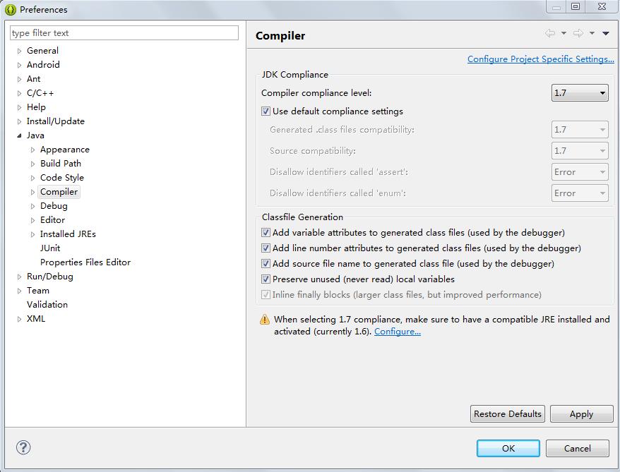 然后左键单击项目,然后点击windows菜单,选择最后一个首选项。打开后选择java--Compiler,然后再右边最上边选择一个版本,比如java1.6或者java1.7