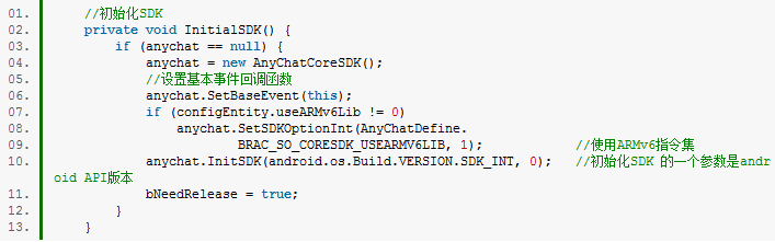 初始化SDK是首先要完成的,用于设置SDK的一些行为,包括设置对应的回调函数。代码如下: