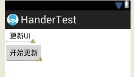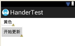 public class MainActivity extends Activity { private EditText UITxt; private Button updateUIBtn; private UIHandler UIhandler; @Override public void onCreate(Bundle savedInstanceState) { super.onCreate(savedInstanceState); setContentView(R.layout.activity_main); UITxt = (EditText)findViewById(R.id.ui_txt); updateUIBtn = (Button)findViewById(R.id.update_ui_btn); updateUIBtn.setOnClickListener(new View.OnClickListener() { public void onClick(View v) { // TODO Auto-generated method stub UIhandler = new UIHandler(); UIThread thread = new UIThread(); thread.start(); } }); } @Override public boolean onCreateOptionsMenu(Menu menu) { getMenuInflater().inflate(R.menu.activity_main, menu); return true; } private class UIHandler extends Handler{ @Override public void handleMessage(Message msg) { // TODO Auto-generated method stub super.handleMessage(msg); Bundle bundle = msg.getData(); String color = bundle.getString("color"); UITxt.setText(color); } } private class UIThread extends Thread{ @Override public void run() { try { Thread.sleep(3000); } catch (InterruptedException e) { // TODO Auto-generated catch block e.printStackTrace(); } Message msg = new Message(); Bundle bundle = new Bundle(); bundle.putString("color", "黄色"); msg.setData(bundle); MainActivity.this.UIhandler.sendMessage(msg); } }}更新后: