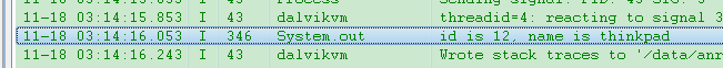 package com.handlerThread;import android.app.Activity;import android.os.Bundle;import android.os.Handler;import android.os.HandlerThread;import android.os.Looper;import android.os.Message;public class handlerThread2 extends Activity { @Override protected void onCreate(Bundle savedInstanceState) { super.onCreate(savedInstanceState); setContentView(R.layout.main); //System.out.println("activity线程ID:"+Thread.currentThread().getId()); HandlerThread handlerThread = new HandlerThread("handlerThread"); handlerThread.start(); MyHandler handler = new MyHandler(handlerThread.getLooper()); Message msg = handler.obtainMessage(); //msg.arg1 = 123;//传递整型数据 //msg.obj = "asd";传递object类型 //利用bundle对象来传值 Bundle b = new Bundle(); b.putInt("ID", 12); b.putString("name", "thinkpad"); msg.setData(b); msg.sendToTarget(); } class MyHandler extends Handler { public MyHandler() { super(); } public MyHandler(Looper looper) { super(looper); } @Override public void handleMessage(Message msg) { super.handleMessage(msg); //int args = msg.arg1; //String s = (String)msg.obj; //获取bundle对象的值 Bundle b = msg.getData(); int id = b.getInt("ID"); String name = b.getString("name"); System.out.println("id is "+id+", name is "+name); //System.out.println("handler线程ID:"+Thread.currentThread().getId()); } }}运行结果