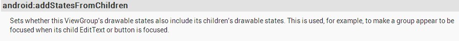设置整个viewGroup的drawable状态是否也包含子空间的drawable状态。该属性用于当子控件editext或者button获得焦点时作为一个组出现使用(翻译的不好,水平有限,理解就好),这样一来,将android:addStatesFromChildren设为true,当组中的EditText或是Button获取焦点时,将Layout的Background设置成相应EditText或的Button的Drawable ,这样看上去该linear中的view是一个整体。