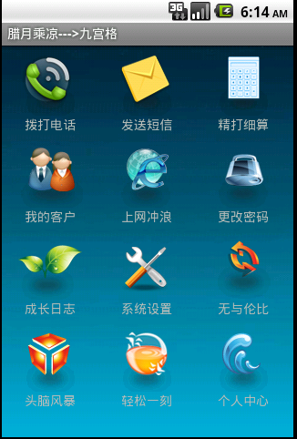 ????? 同事很多对android感兴趣,公司组织了次技术讨论会,他们由于之前没做过android开发,我也只是参与了android开发的表层,下午我分享我的android开发示例。这里将源码和ppt放出来,就当备忘库了。里面有九宫格布局示例,也有android单元测试示例。如图: