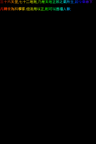 public class Test extends Activity { private TextViewTest mTextViewTest; /** Called when the activity is first created. */ @Override public void onCreate(Bundle savedInstanceState) {  super.onCreate(savedInstanceState);  mTextViewTest = new TextViewTest(this);  setContentView(mTextViewTest); } public class TextViewTest extends TextView {  private LinearGradient mGradient;  private int[] mGradientColors = { Color.RED, Color.rgb(255, 165, 0),    Color.YELLOW, Color.GREEN, Color.rgb(0, 255, 255), Color.BLUE,    Color.rgb(160, 32, 240) };  private int mTitleWidth;  private String mTitle = "三十六天罡,七十二地煞,乃是天地正邪之氣所生,如今奉命下凡轉世為科學家.但法用以正,則可以造福人群;";  public TextViewTest(Context context) {   super(context);   // TODO Auto-generated constructor stub   setLayoutParams(new LinearLayout.LayoutParams(     LinearLayout.LayoutParams.FILL_PARENT,     LinearLayout.LayoutParams.FILL_PARENT));   setWillNotDraw(false);  }  @Override  protected void onDraw(Canvas canvas) {   // TODO Auto-generated method stub   super.onDraw(canvas);   measure(0, 0);      Paint paint = new Paint();   paint.setStyle(Style.FILL_AND_STROKE);   mGradient = new LinearGradient(0, 0, getWidth(),     getMeasuredHeight(), mGradientColors, null, TileMode.REPEAT);   paint.setShader(mGradient);      mTitleWidth = 0;   float[] width = new float[mTitle.length()];   paint.getTextWidths(mTitle, width);   Log.i("Tag", "Width.length= " + width.length);   int start = 0;   int offsetY = 10;   for (int j = 0; j < mTitle.length(); j++) {    mTitleWidth += (int) Math.ceil(width[j]);    if (mTitleWidth > getWidth()) {     canvas.drawText(mTitle.substring(start, j), 0, offsetY,       paint);     mTitleWidth = 0;     start = start + j;     offsetY = offsetY + getMeasuredHeight() + 5;     j--;    }   }   if (mTitleWidth > 0) {    canvas.drawText(mTitle.substring(start), 0, offsetY, paint);   }  } }}