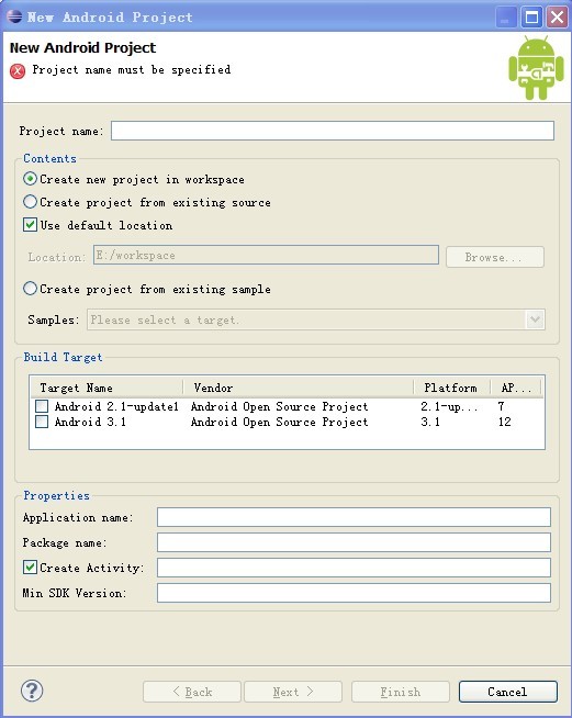 Create Activity 选择框,如果选中,则必须给Eclipse一个Activity名,Eclipse会按照这个名字初始化一个继承自Activity的子类,当然,如果不选,则表示你告诉eclipse你自己去创建Activity;
