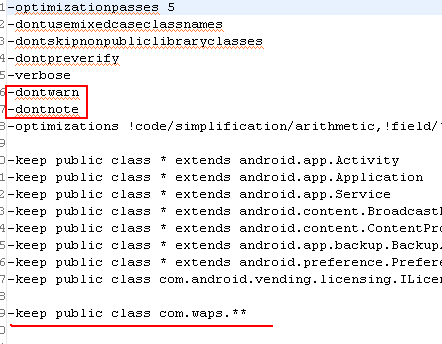 还有一个我遇到的问题,比如我植入广告,用到一个广告商提供的jar包,但是proguard总是混淆出错。这时候,最好滤过对这个jar里类的混淆,然后关闭proguard的警告,就可以正常打包了,如图。