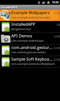 package dyingbleed.iteye;import java.util.ArrayList;import java.util.List;import android.app.ListActivity;import android.content.Context;import android.content.pm.ApplicationInfo;import android.content.pm.PackageInfo;import android.graphics.drawable.Drawable;import android.os.Bundle;import android.os.Handler;import android.os.Message;import android.view.LayoutInflater;import android.view.View;import android.view.ViewGroup;import android.widget.BaseAdapter;import android.widget.ImageView;import android.widget.TextView;public class Main extends ListActivity {		private Handler handler = new Handler() {		@Override		public void handleMessage(Message msg) {			super.handleMessage(msg);			int what = msg.what;			switch(what) {			case 0 :				List<APP> data = (List<APP>) msg.obj;				setListAdapter(new APPListViewAdapter(Main.this, data));				break;			}		}			};	    @Override    public void onCreate(Bundle savedInstanceState) {        super.onCreate(savedInstanceState);        setContentView(R.layout.main);                new Thread(new InstalledAPPTask()).start();    }        private class APPListViewAdapter extends BaseAdapter {    	    	private Context context;    	private List<APP> data;    	    	public APPListViewAdapter(Context context, List<APP> data) {    		this.context = context;    		this.data = data;    	}		@Override		public int getCount() {			return data.size();		}		@Override		public Object getItem(int position) {			return data.get(position);		}		@Override		public long getItemId(int position) {			return position;		}		@Override		public View getView(int position, View convertView, ViewGroup parent) {			if(convertView == null) {				convertView = LayoutInflater.from(context).inflate(R.layout.item, null);			}			ImageView icon = (ImageView) convertView.findViewById(R.id.item_IconImageView);			TextView name = (TextView) convertView.findViewById(R.id.item_NameTextView);			TextView packageName = (TextView) convertView.findViewById(R.id.item_PackageNameTextView);			TextView versionName = (TextView) convertView.findViewById(R.id.item_VersionNameTextView);						icon.setImageDrawable(data.get(position).getIcon());			name.setText(data.get(position).getName());			packageName.setText(data.get(position).getPackageName());			versionName.setText(data.get(position).getVersionName());						return convertView;		}    	    }        private class InstalledAPPTask implements Runnable {    			@Override		public void run() {			List<APP> appList = achieveAPPList();			handler.sendMessage(handler.obtainMessage(0, appList));		}				private List<APP> achieveAPPList() {			List<APP> result = new ArrayList<APP>();						List<PackageInfo> packageInfoList = getPackageManager().getInstalledPackages(0); //返回已安装的包信息列表			for(PackageInfo packageInfo : packageInfoList) {				/*				 * 判断是否为非系统应用				 * */				if((packageInfo.applicationInfo.flags&ApplicationInfo.FLAG_SYSTEM) == 0) {					APP app = new APP();					app.setIcon(packageInfo.applicationInfo.loadIcon(getPackageManager()));					app.setName(packageInfo.applicationInfo.loadLabel(getPackageManager()).toString());					app.setPackageName(packageInfo.packageName);					app.setVersionName(packageInfo.versionName);					result.add(app);				}			}			return result;					}			}        private class APP {    	    	private String name; //应用名    	private String packageName; //包名    	private String versionName; //版本名    	private Drawable icon; //应用图标    	    	public String getName() {    		return name;    	}    	    	public void setName(String name) {    		this.name = name;    	}    	    	public String getPackageName() {    		return packageName;    	}    	    	public void setPackageName(String packageName) {    		this.packageName = packageName;    	}    	    	public String getVersionName() {    		return versionName;    	}    	    	public void setVersionName(String versionName) {    		this.versionName = versionName;    	}    	    	public Drawable getIcon() {    		return icon;    	}    	    	public void setIcon(Drawable icon) {    		this.icon = icon;    	}    }}