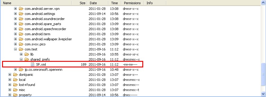 这段代码执行过后,即在/data/data/com.test/shared_prefs目录下生成了一个SP.xml文件,一个应用可以创建多个这样的xml文件。如图所示:?