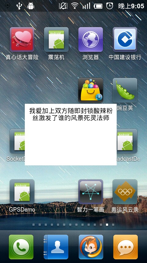 package com.cfuture.desktop;import android.app.Activity;import android.content.Intent;import android.os.Bundle;import android.view.View;public class AndroidDesktopActivity extends Activity { //一个有只有一个按钮的activity @Override public void onCreate(Bundle savedInstanceState) { super.onCreate(savedInstanceState); setContentView(R.layout.main); } public void funClick(View v){ //按钮被点击 this.startService(new Intent(this,Mser.class));// new TableShowView(this).fun(); 如果只是在activity中启动 // 当activity跑去后台的时候[暂停态,或者销毁态] 我们设置的显示到桌面的view也会消失// 所以这里采用的是启动一个服务,服务中创建我们需要显示到table上的view,并将其注册到windowManager上 this.finish(); }}??然后是一个服务