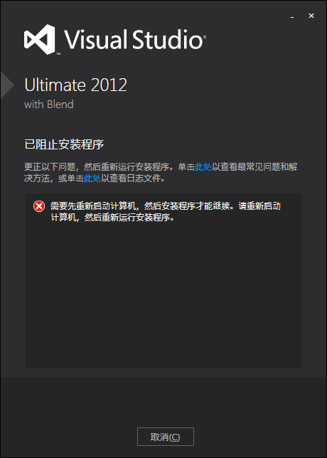 我得系统是win7旗舰版,我先安装了VS2012,但安装到一半报错,于是我就卸载了,正好我想重装系统,换过系统后在安装就报出如图错误,我也找度娘了没有好办法,之