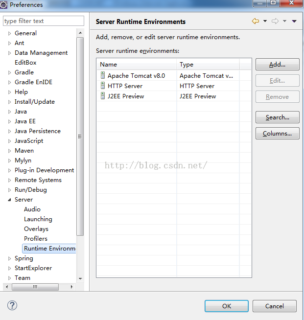 打开Eclipse,Window->Preferences->Server->Runtime Environment,如下图所示: