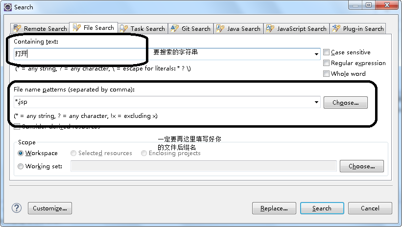 如果你需要根据文件中的字符串查找文件,那么,你可以通过Ctrl+H唤出查找与替换的窗口,切换到File Search选项卡中。输入你要搜索的字符串,与此字符串可能存在的文件后缀名,如果不记得输入*.*,输入文件后缀的原因是为了减少Eclipse的搜索量,加快搜索速度。