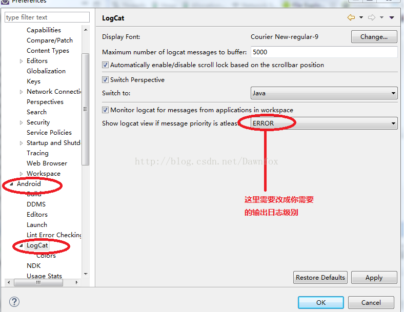 在菜单栏找到Windows——Preferences——Android——LogCat