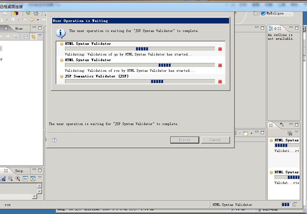 二月份的某天,从我的电脑上,拷贝了几个新编辑好的jsp和java文件,通过远程连接拷贝到服务器端的硬盘上,然后在服务器端的MyEclipse上,点击了刷新,然后MyEclipse就可以进行“更新”了。但运行到HTML Syntax Validator的时候,好像就停不下来了(MyEclipse的软件窗口的右下角,有个进度条显示不停地在这个事情)。我刚开始没有理它,以为不会搞很久的。