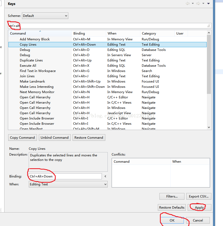 Eclipse自带的快速复制下一行的快捷键copy line 是Ctrl+Alt+Down,但是有时由于我们的电脑安装了音乐播放器,视频播放器之类的,倒置快捷键冲突,按了这些组合键会出现屏幕倒置,很蛋疼的。我的acer电脑还出现了显卡快捷键冲突,只有禁用显卡快捷键了。总之,不同的电脑会出现各种各样奇奇怪怪的问题,所以,我干脆改变Eclipse的快捷键算了,虽然刚刚开始用的不是很习惯,渐渐的也就好了。