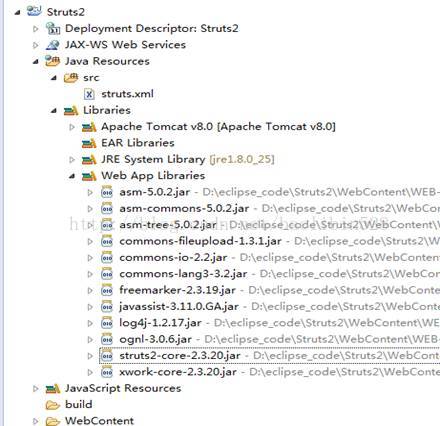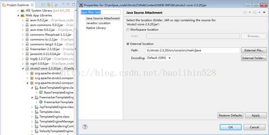 3、右键struts2-core-2.3.20.jar,选择properties,在里面设置源码路径。