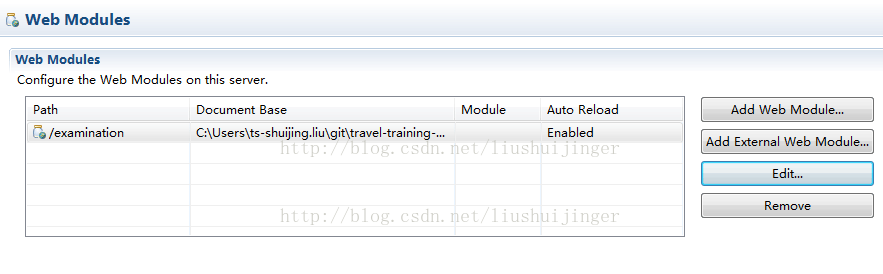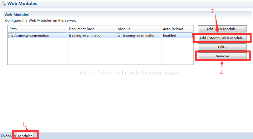在Tomcat属性面板左下角选择Modules选项卡,将默认的那一项删掉,然后添加一个扩展的Web Modules。