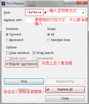 MyEclipse本身自带有查找替换功能,并且支持正则表达式替换,使用正则替换就可以很容易去除这些行号