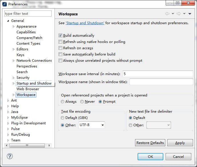 ?window --preferences。弹出如下界面,设置工作空间的字符集编码: