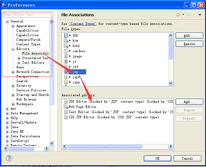 windows ==> preferences ==> General ==> Editors ==> file Associations,