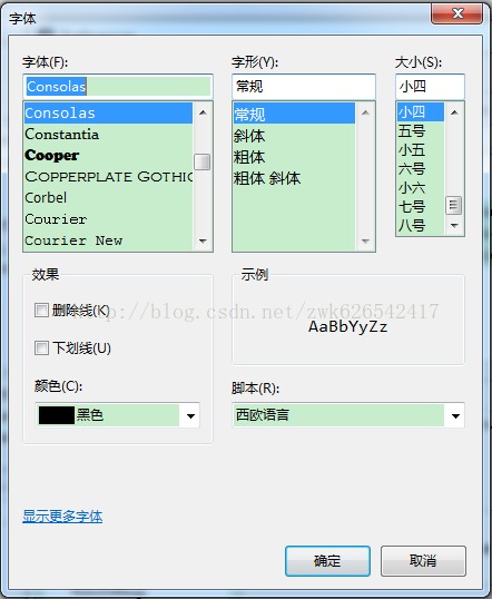 在这里还有一点要说下,就是有的版本在刚才的字体里可能找不到“CourierNew”,我们可以点击字体选择框左下角的“显示更多字体”链接来打开设置字体的控制面板,找到“CourierNew”,右键选择“显示”即可激活该字体)——点击按钮“确定”——点击按钮“OK”,完成。