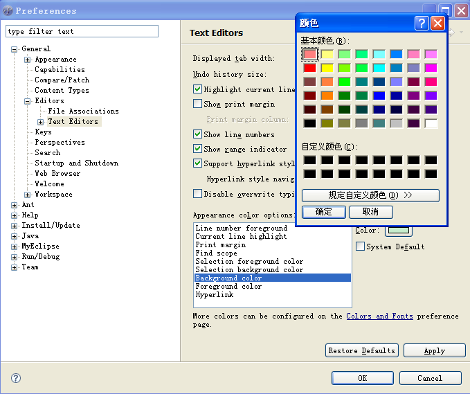 3、选中 Text Editors,右边出现Text Editors面板。 面板中有这样一个选项:Appearance color options; 其中是各种板块颜色的设置,其中有一项是background color,根据自己的喜好选择颜色。