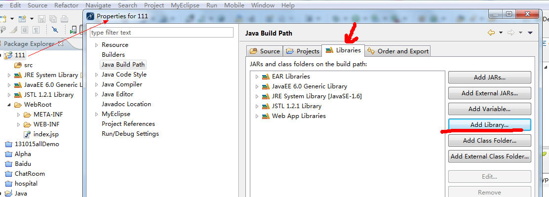 老版本MyEclipse,找不到Web App Libraries的,请在左侧项目名上点右键,属性,在此位置更改: