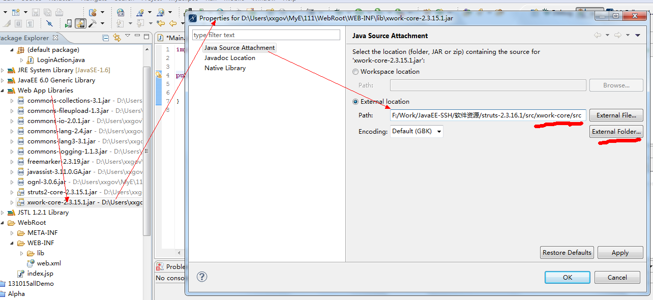 Web App Libraries显示的外部包下,右键,主要对xwork和struts两个包指定即可。如有需要请自行添加其它包。