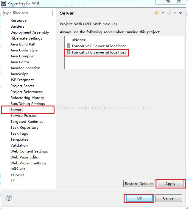 8、选中Server,选择你要使用的Tomcat→Apply→OK