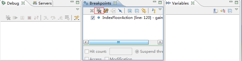 点“Debug”模式,然后点“BreakPoints”,再点红色区域的叉号就OK了,如下图