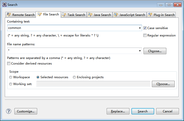 1, ctrl+ H 打开 eclipse 的 search 面板, 2. 选择 File Search 的tab, 3. 选中 Regular expression 复选框, 4. 在 Containing text 输入框中 输入你要替换(查找)的正则表达式 ,例如我们要将 href="aaabbbccc.do" 替换为 href="" 其中 aaabbbccc为不定内容(当然是不定的,如果是一定的那就不需要用regular expression这么麻烦了)则输入 href="(/w+/.do)" 这里要注意了 其中的 小括号 代表一个正则匹配,匹配那些不固定的值 5. 点击 Replace 按钮,弹出 Replace 面板,在第二个输入框里数据 目标字符串,href="" 注意:其中的 $1 代表 上面输入过的 第一个小括号中正则匹配的不固定的值 6. 点击 Replace All 一切OK