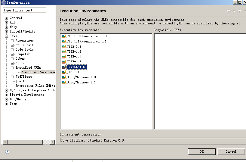 window-perferences-java-installedJREs-Execution Environment 选择左边的列表j2se1.6