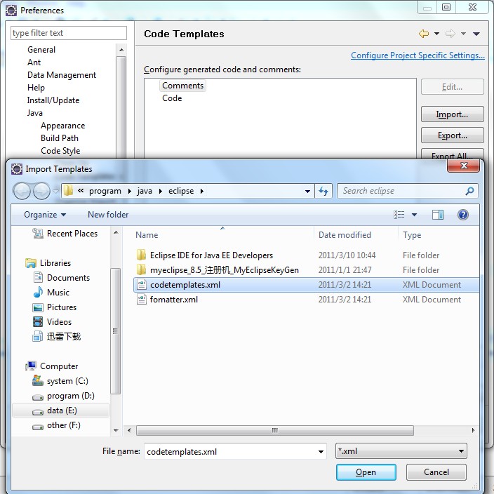下面的三个设置主要是为了统一文件编码和代码风格,还有就是提高代码的可读性,可以按以下步骤设置。(两个模板文件codetemplates.xml和formatter.xml在附件中,rar压缩格式)