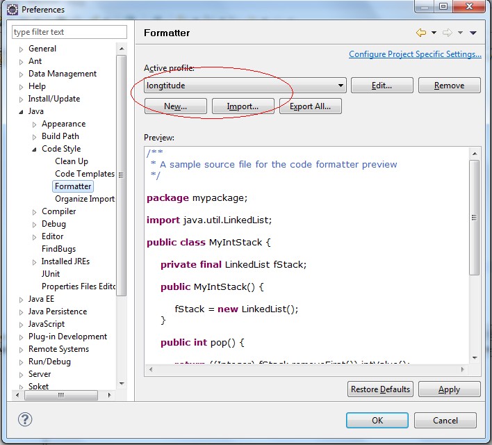 3.导入附件的格式化模板formatter.xml并选择longtitude作为当前配置