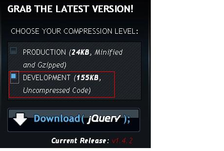 1. 从JQuery.com下载开发用的Javascript文件,如下图,一定要选择红框里面的选项。