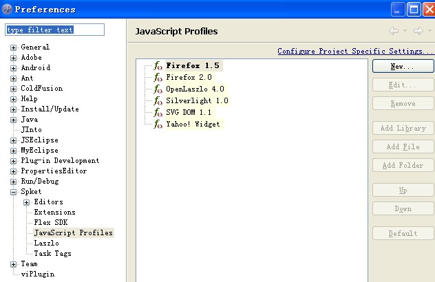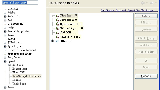 2. 配置Eclipse里面的Spket Javascript Profiles,如下图: