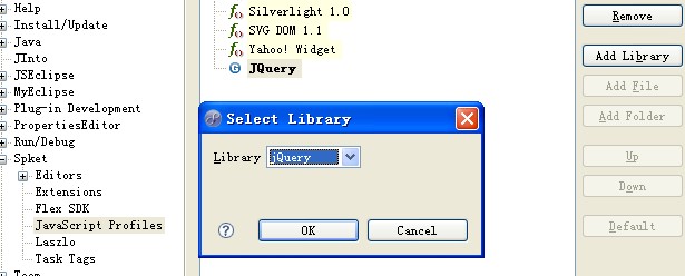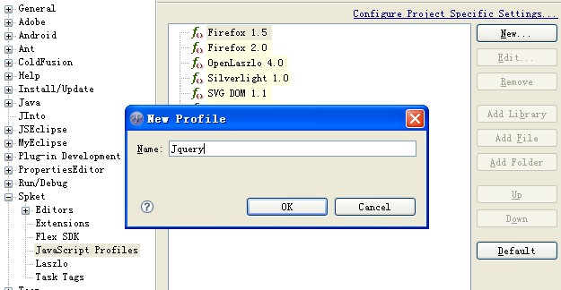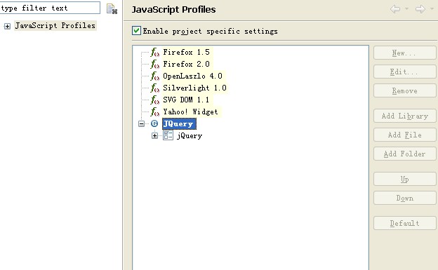 点选JQuery并使其成为Default即可。这时只有在这个项目中才使用JQuery为缺省Profile。
