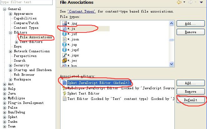 8、最后选中General—Editors—File Associations,将js文件的默认打开方式设置为spket javascript editor,这样以后在MyEclipse中编辑js文件就有自动提示了