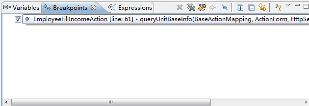 切换到DEBUG视图中,在右上角的BreakPoints栏中,可以看到刚刚增加的断点: